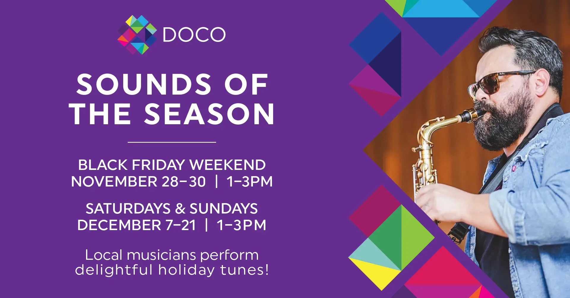 A visit to DOCO during the holidays is a delightful experience. There are plenty of shops and places to eat, drink and be merry! While you're here, enjoy weekend afternoon entertainment by Ryan Hernandez Events and other local musicians as they amplify West Plaza with holiday tunes. Plus, our beautifully adorned trees, wreaths and other backdrops offer sparkling holiday photo ops this season.